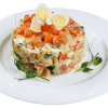 Слабосоленая семга, картофель, яйцо куриное, морковь, горошек консервированный, огурец свежий, майонез, горчица, яйцо перепелиное. Оформление заказа за 3 дня.