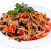 Отварная говядина, перец болгарский, красная фасоль, грецкий орех, лук, помидоры черри, чеснок, специи, заправка на основе винного уксуса, зелень. Оформление заказа за 3 дня.