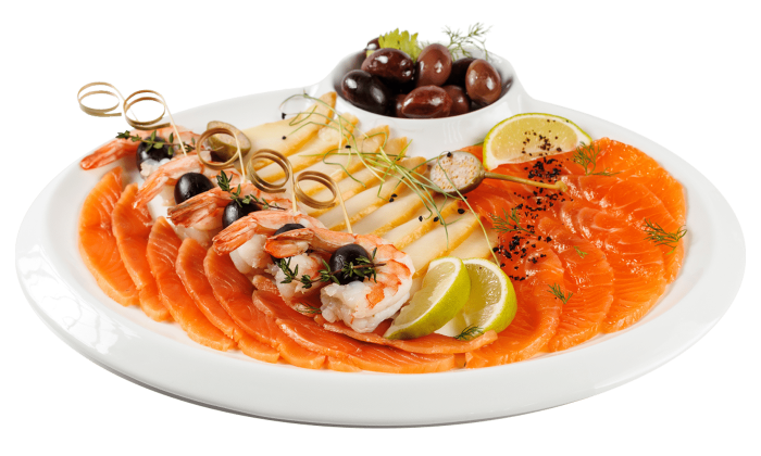 Лосось слабого посола, лосось холодного копчения, масляная рыба, креветки тигровые, лайм, маслины, оливки . Оформление заказа за 3 дня.