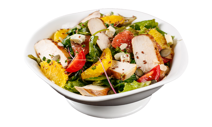 Салат с курицей гриль, сегментами апельсина и грейпфрута, томатами черри, сыром дор-блю и семенами тыквы и льна. Оформление заказа за 3 дня.