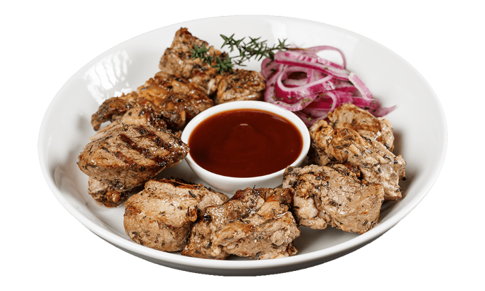 Шашлык из свиного ошейка. Подается с соусом BBQ и маринованным красным луком. Оформление заказа за 3 дня.