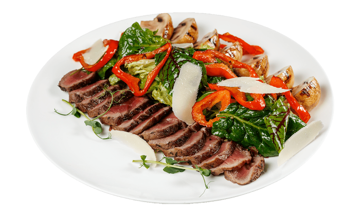 Микс салатной зелени, заправленные авторским дрессингом, вырезка говяжья прожарки MEDIUM, сладкий перец, шампиньоны, томаты черри, посыпанное всё тертым сыром пармезан. Оформление заказа за 3 дня.