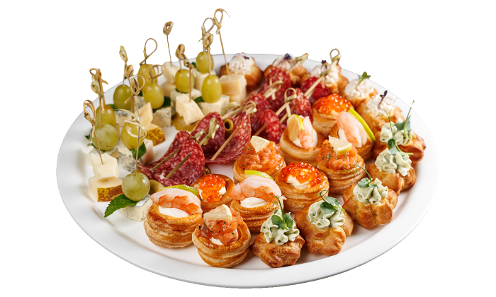 Волованы с икрой, с креветкой, с лососем, профитроли с ветчиной, профитроли со сливочным сыром и чесноком, канапе с сыровяленой колбасой, канапе с сырами и ягодами. Оформление заказа за 3 дня.