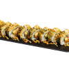 Ролл в хрустящей панировке с начинкой из креветки, лосося, сурими, огурца, при подаче поливается луковым айоли и соусом терияки.