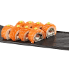 Ролл с начинкой из омлета томаго, лосося, сурими и перьев зеленого лука, с шапочкой из сливочного сыра, свежего огурца и пикантного соуса.
