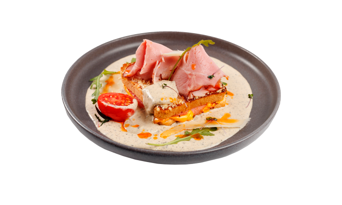 Сэндвич с начинкой из сыра Хохланд и ветчины, подается со сливочным соусом с добавлением трюфеля, посыпанные сыром пармезан. с 10:00 до 12:00