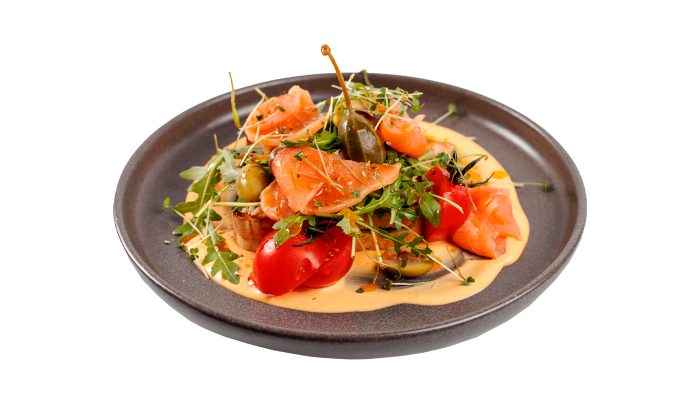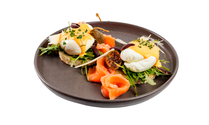Хрустящие гренки, руккола, яйца пашот, соус Голландский, лосось слабосоленый, маслины. с 10:00 до 12:00