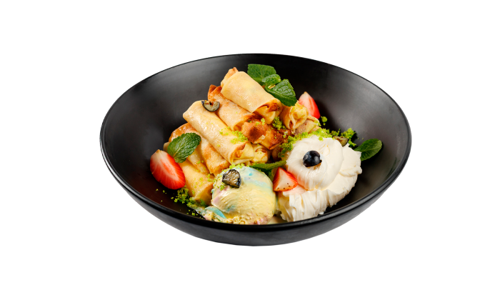 Блины с начинкой из творога и изюма, подаются со сладким сливочным сыром и ягодным мороженым . с 10:00 до 12:00