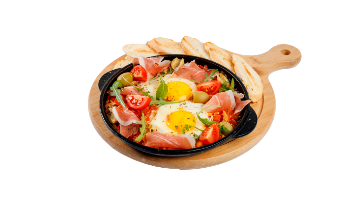 Соус на основе спелых томатов и базилика, яйца куриные, с добавлением сыра пармезан, оливок и сыровяленого хамона с 10:00 до 12:00