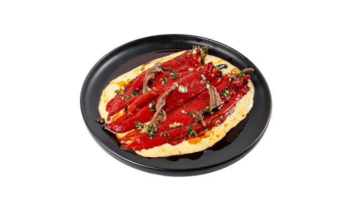 Печёный перец в сочетании соусом Вителло Таннато и маринованными анчоусами