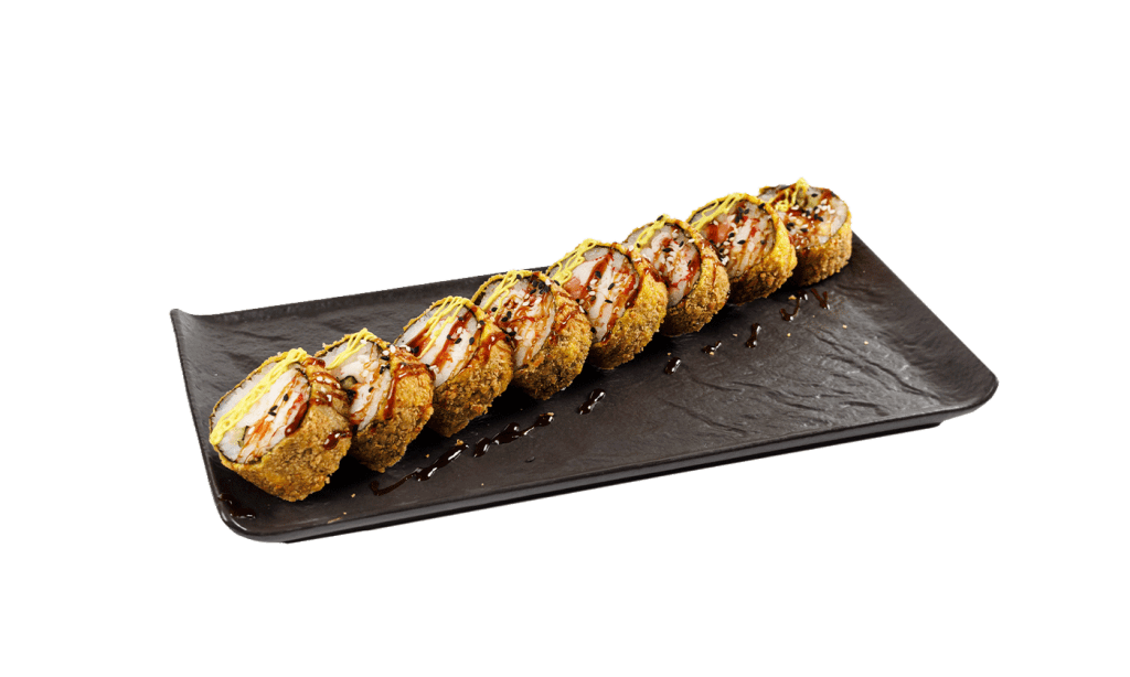 Ролл в хрустящей панировке с начинкой из креветки, лосося, сурими, огурца, при подаче поливается луковым айоли и соусом терияки.