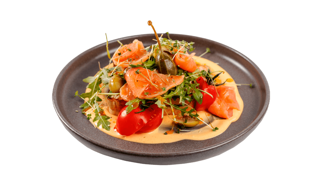 Сэндвич с начинкой из соуса голландез и авокадо, подается со слабосоленым лососем, рукколой и каперсами.