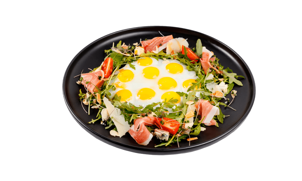 Яичница из перепелиных яичек, с рукколой, хамоном, томатами черри и сыром ракфор.