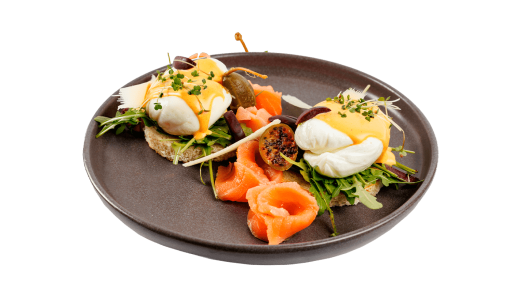 Хрустящие гренки, руккола, яйца пашот, соус Голландский, лосось слабосоленый, маслины.